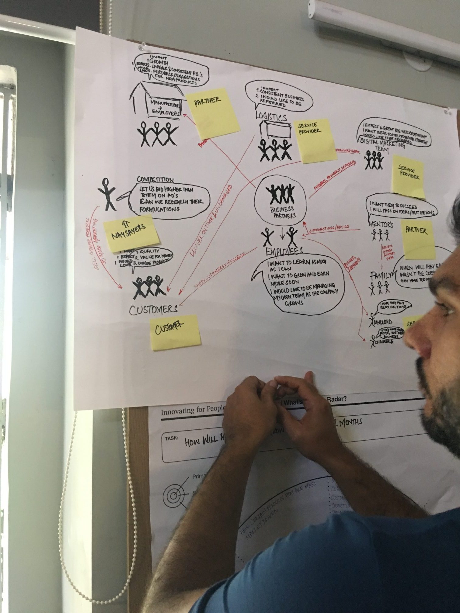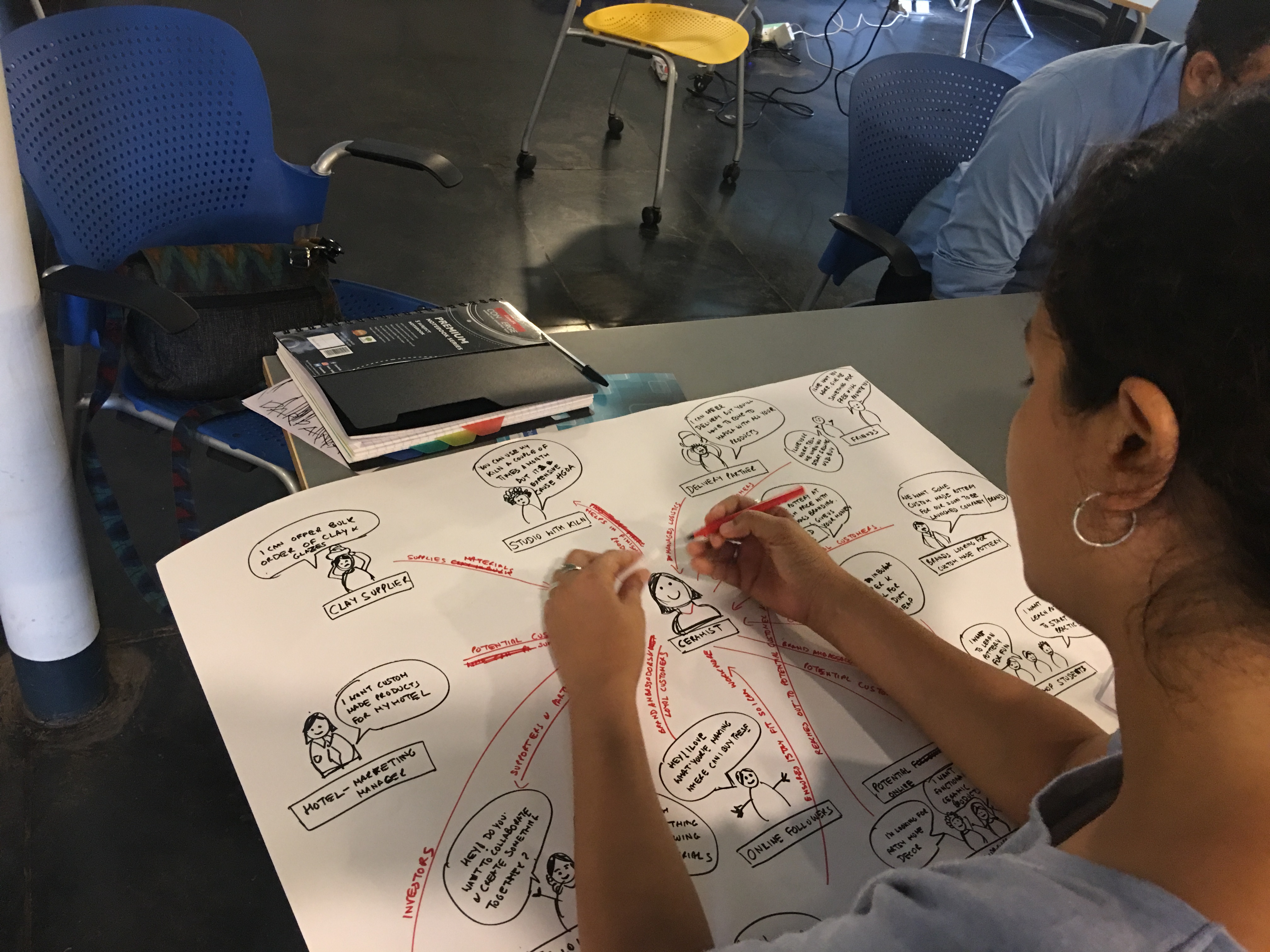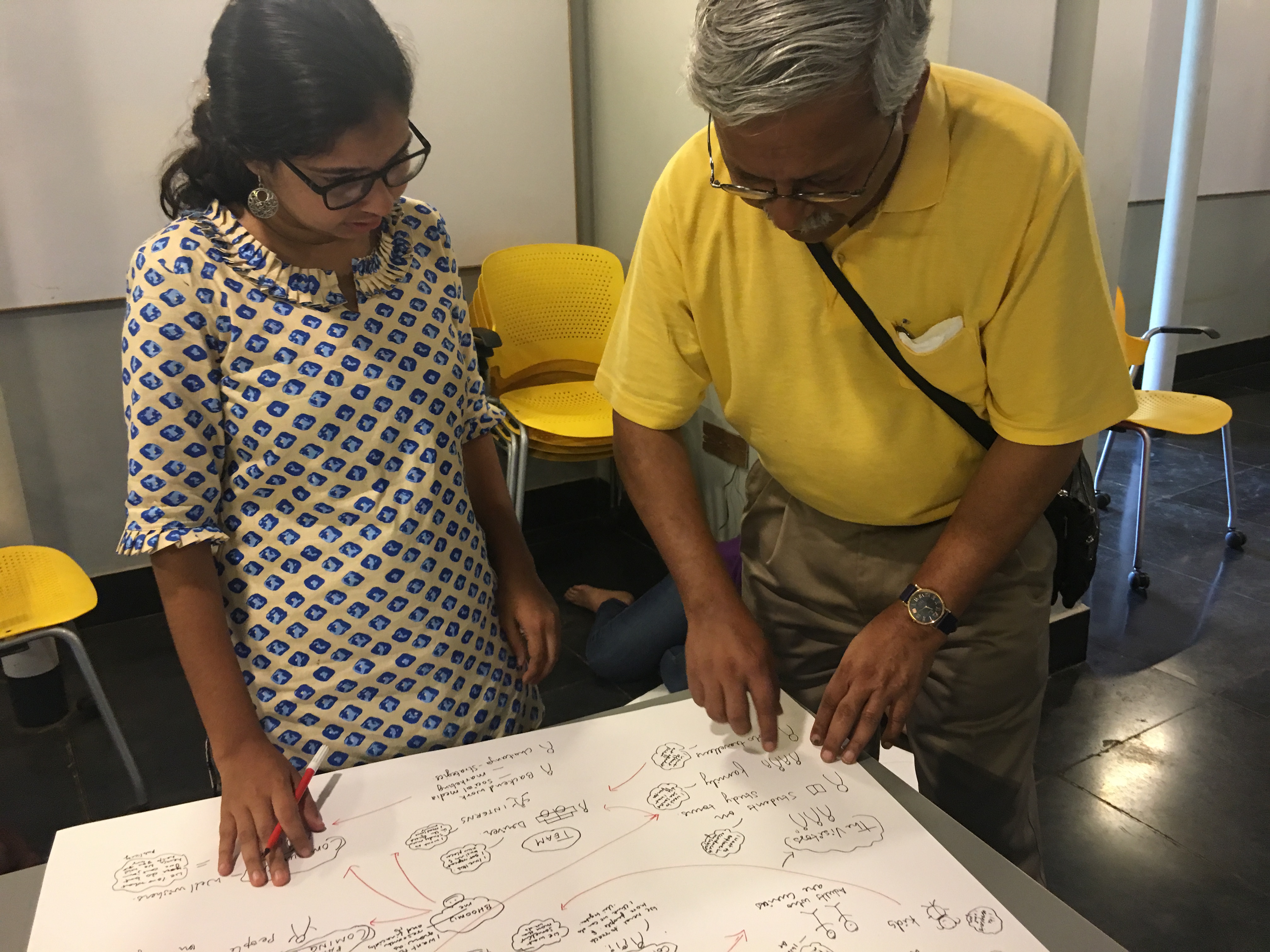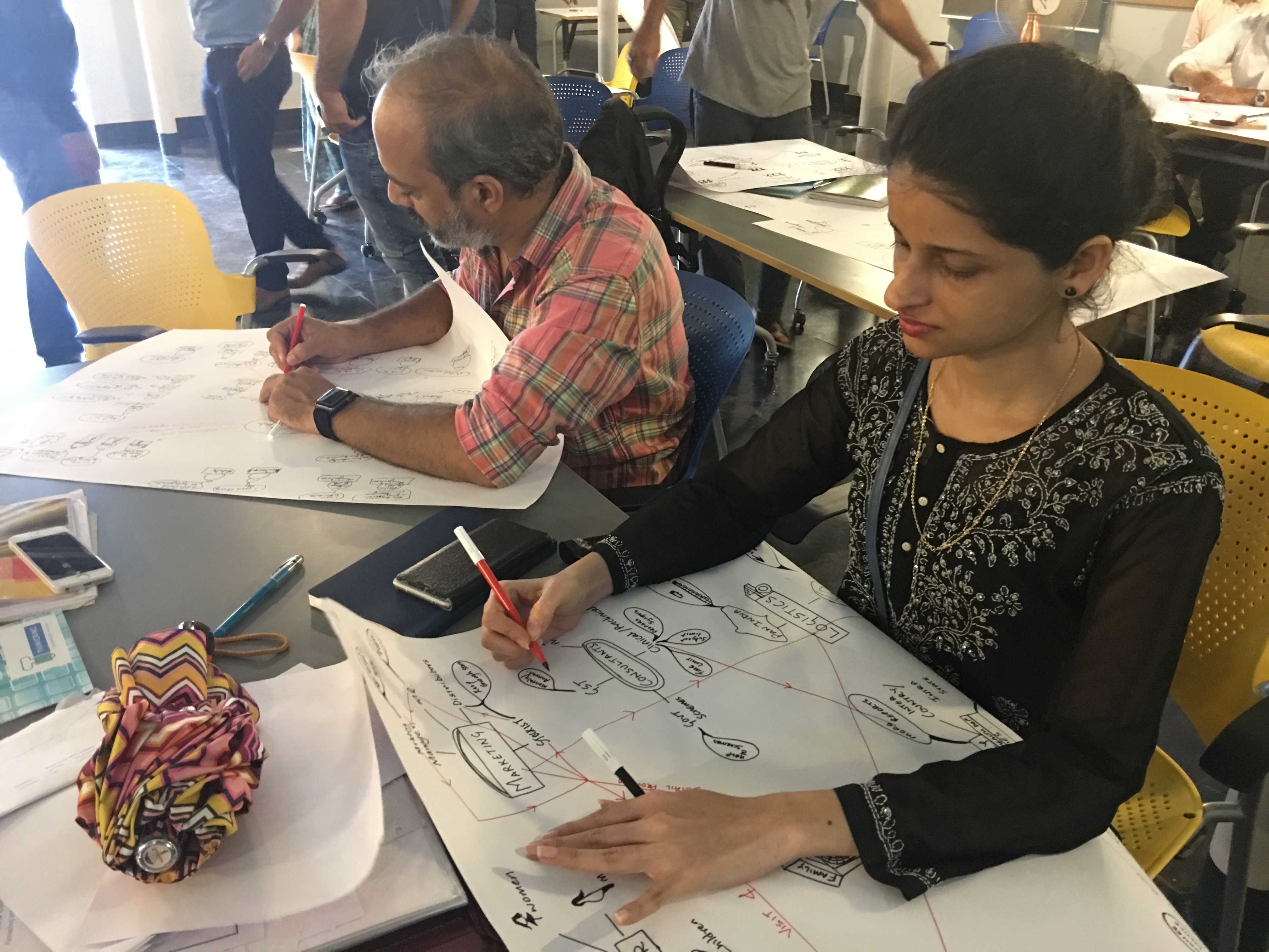 ‘Affinity Clustering’ the exercise that followed, was a convergent activity. Poring over the maps they had drawn, participants clubbed together processes and synergistic activities. Logical relationships were linked and circled. The ubiquitous design thinking tool–the post-it– made its appearance in this stage. The post-it allowed participants to rapidly regroup and ungroup business specific processes as they worked. Bit by bit, the chaotic looking stakeholder map was tamed to a more manageable state.
