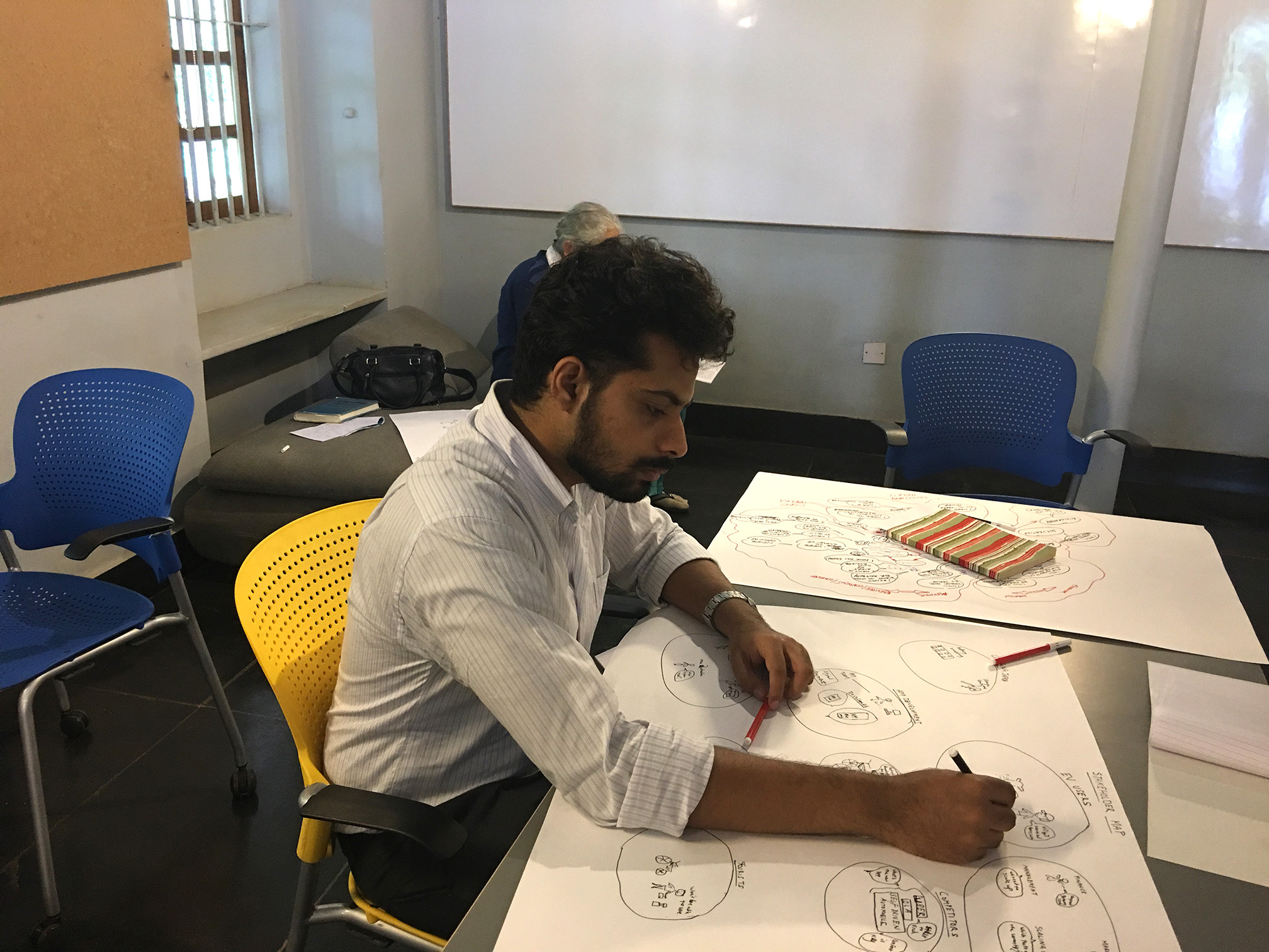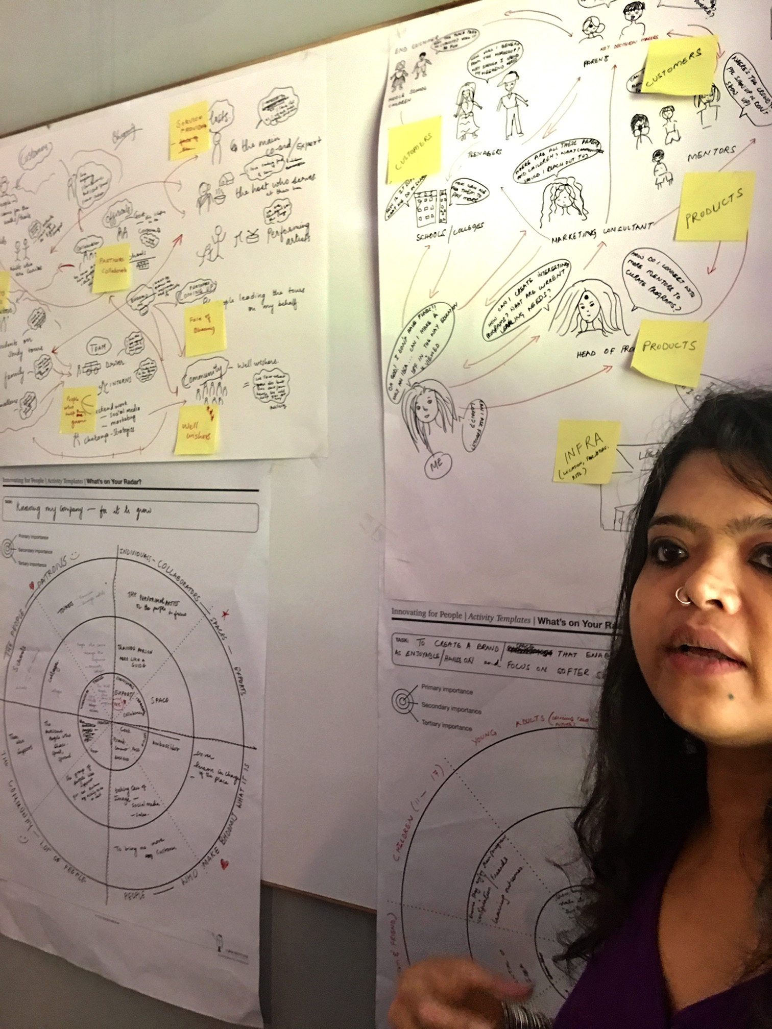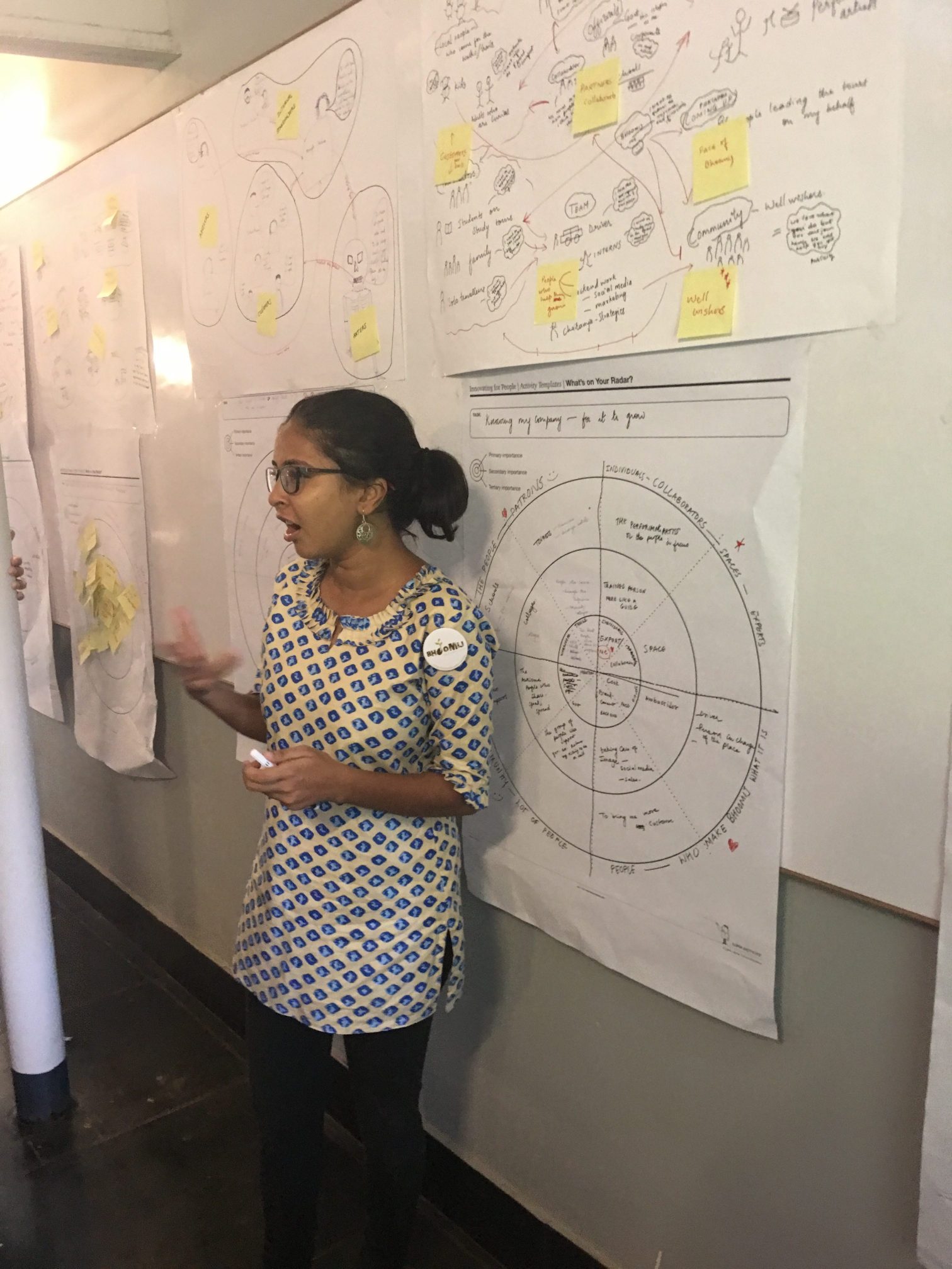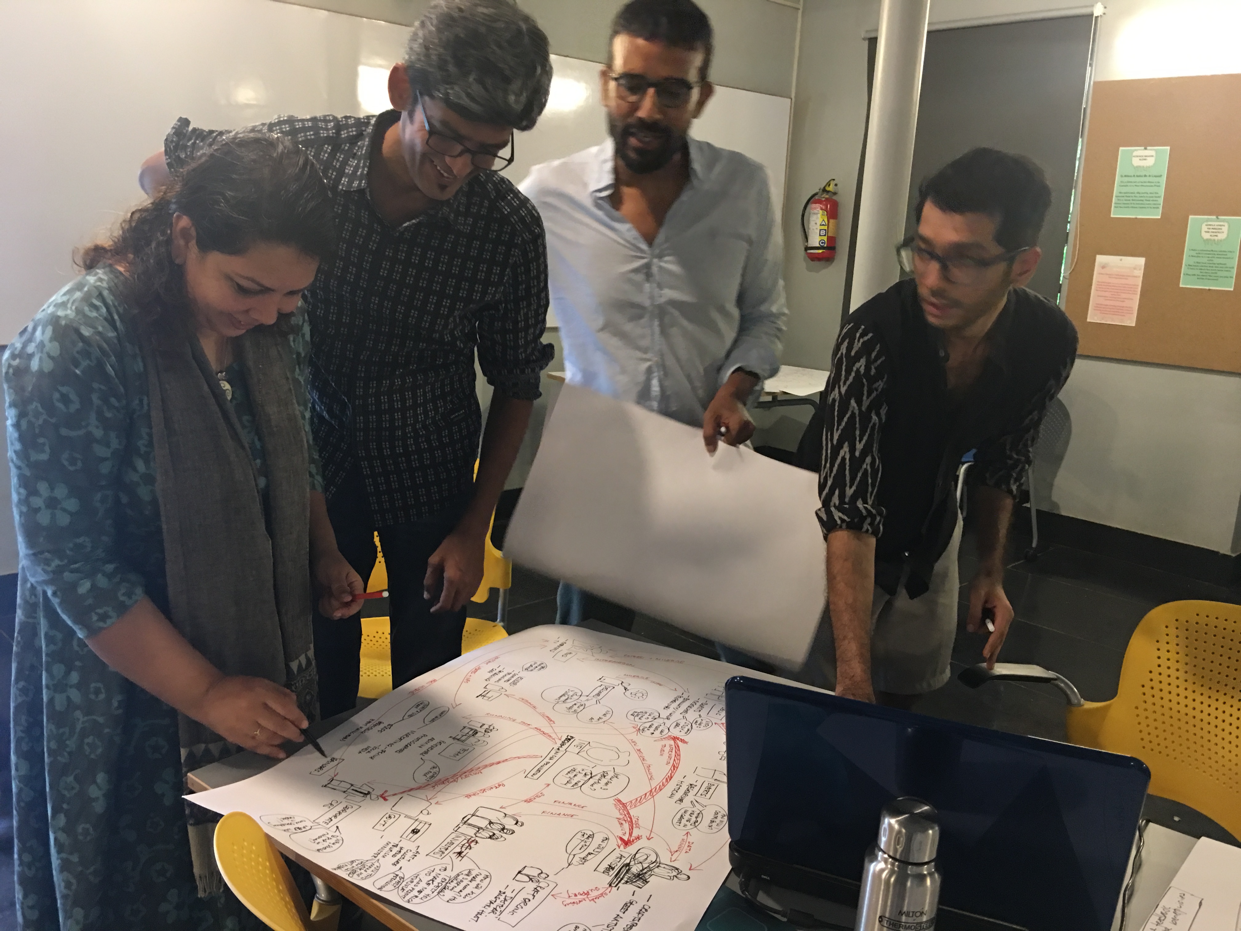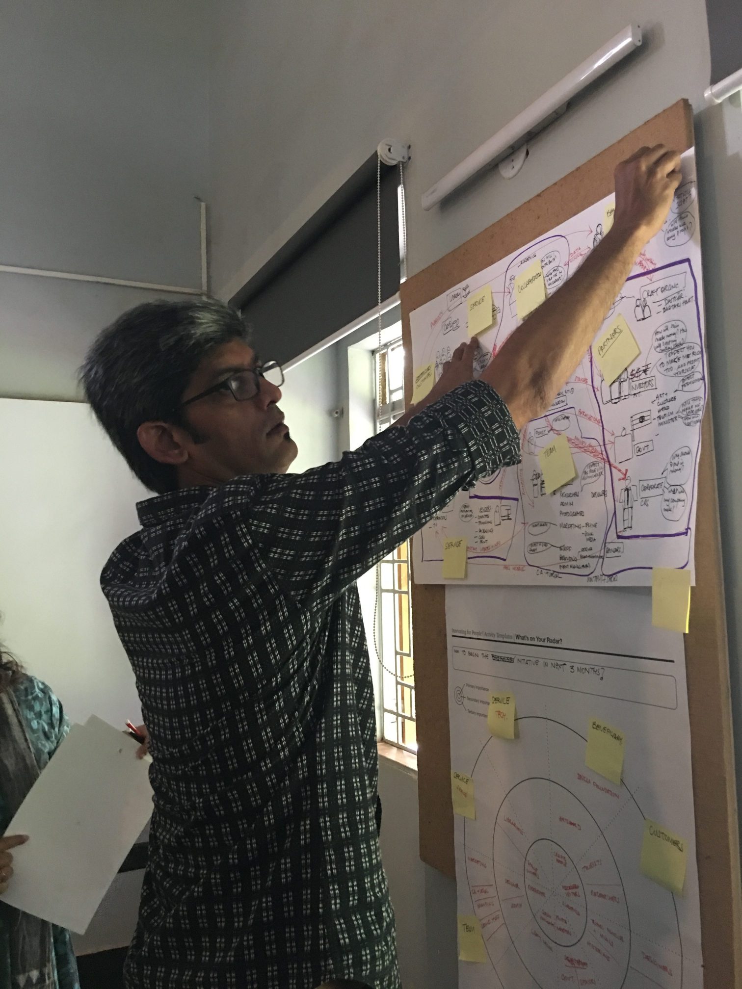 ‘Affinity Clustering’ the exercise that followed, was a convergent activity. Poring over the maps they had drawn, participants clubbed together processes and synergistic activities. Logical relationships were linked and circled. The ubiquitous design thinking tool–the post-it– made its appearance in this stage. The post-it allowed participants to rapidly regroup and ungroup business specific processes as they worked. Bit by bit, the chaotic looking stakeholder map was tamed to a more manageable state.